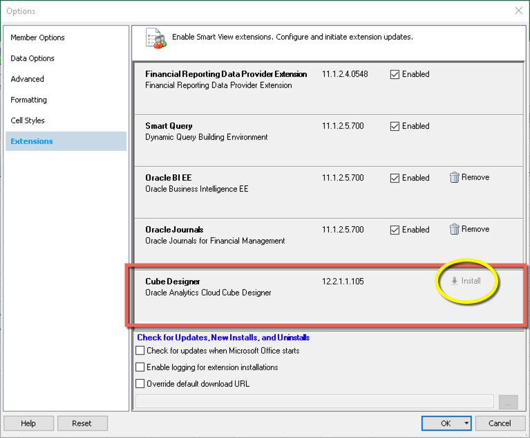 I already connected and was able to connect via Smart View and ‘Install’ed the Cube Designer Extension!