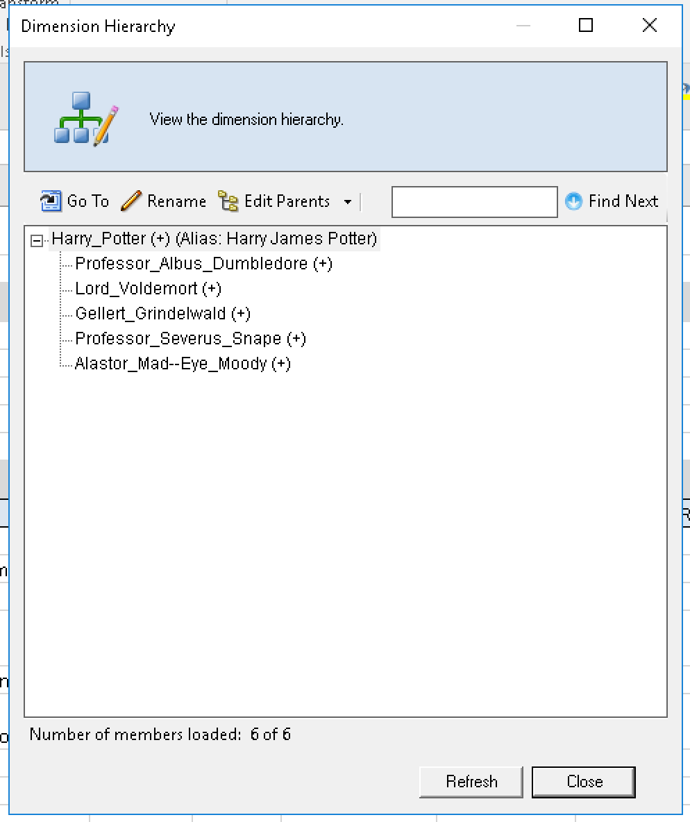 So in the Dimension that I wanted to create, Harry_Potter I started to define what that hierarchy was going to be .. and added a few members manually.. take a look what happened when I clicked the ‘View Hierarchy’ button on the ribbon, I can see what the hierarchy looks like and even make edits from this GUI window, very nice!