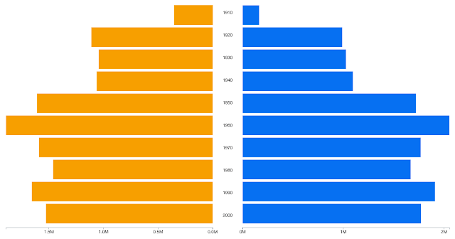 It was also interesting to take a look at the trend using the custom Butterfly Viz as I was particularly trying to see if there really was a baby boom. This is what I found. Id does appear that there was a baby boom in the 1960s